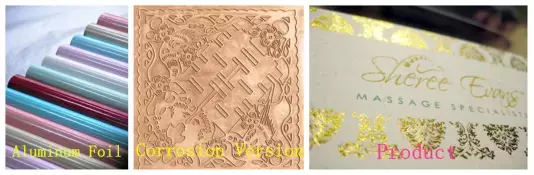 ที่อุณหภูมิและความดันที่แน่นอนการถ่ายโอนอลูมิเนียมฟอยล์ไปยังพื้นผิวผลิตภัณฑ์รูปแบบและคำที่แตกต่างกันด้วยสังกะสีหรือการกัดกร่อนทองแดงที่แตกต่างกัน